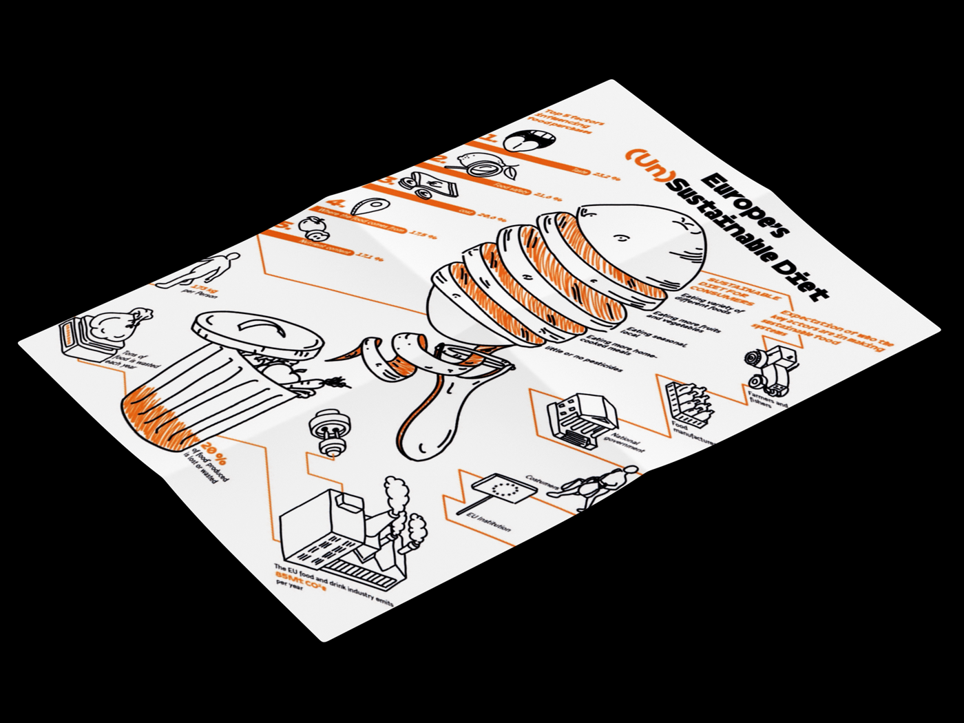 As part of this, I designed an interactive infographic where readers could "remove" food waste reasons from a trashcan and explore additional reasons on a foldable page. This interactive element allowed users to engage directly with the topic and even add their own insights, acknowledging that food waste has countless causes beyond those listed.